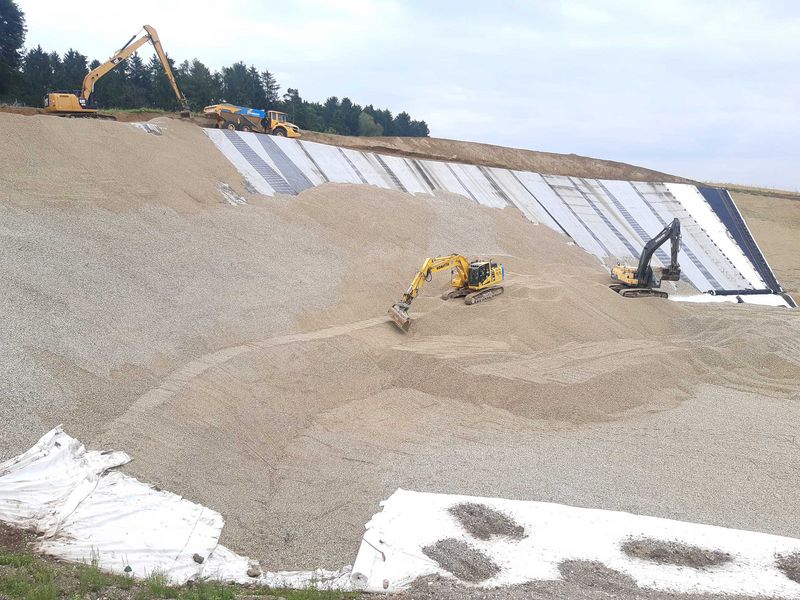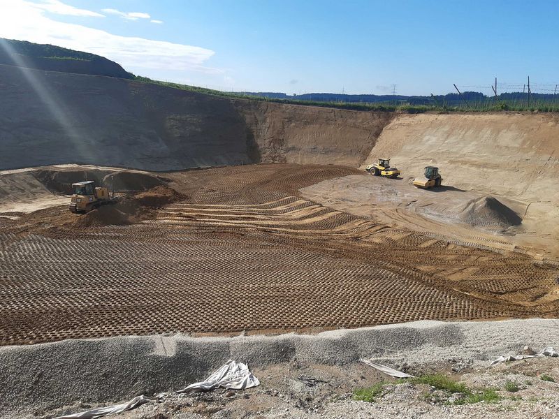 Nach Entfernung des natürlich anstehenden Materials wurde die Basisdichtung der DK 0-Deponie durch die Hagn Umwelttechnik hergestellt – insgesamt 6.500 Quadratmeter mineralische Dichtung für die Sohle und 8.500 Quadratmeter Kunststoffdichtung für die Böschung.
