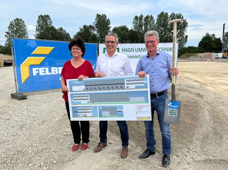 Aus Österreich angereist waren die Eigentümerfamilie Felbermayr samt Führungscrew und dem Planungsteam des technischen Architekturbüros Wondrak. Bei bester Stimmung begrüßte Horst Felbermayr die Anwesenden, verbunden mit den besten Wünschen für ein erfolgreiches und unfallfreies Bauvorhaben, welches in Rekordzeit abgeschlossen werden soll und merkt an: „Der neue Standort dient als Ersatz für die derzeit gemietete Liegenschaft in Hengersberg.“ Begeistert war auch die Bürgermeisterin über den Zuwachs in ihrer Gemeinde und betonte: „Es ist eine äußert gute und unkomplizierte Zusammenarbeit zwischen Stadtregierung und dem Unternehmen.“ Überdies wies sie auch auf die Bedeutung von Betriebsansiedelungen für das Funktionieren des kommunalen Zusammenlebens sowie der sozialen und wirtschaftlichen Entwicklung in der gesamten Region hin. Unter dem Motto „es wächst zusammen, was zusammengehört“ fand auch Landrat Bernd Sibler treffend schöne Worte zum Spatenstich: „Umweltbewusstsein und Nachhaltigkeit sind tragende Säulen für eine lebenswerte Zukunft und genau diesen Herausforderungen stellt sich die Hagn Umwelttechnik.“