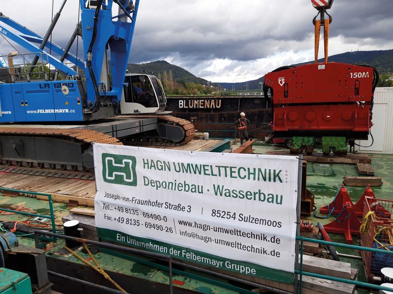 Mit einem üblichen Durchfluss von rund 150 Kubikmetern pro Sekunde ist der etwa 380 Kilometer lange Neckar eher als gemütlich zu bezeichnen. Bei Hochwasser allerdings kann der Durchfluss auch ein Vielfaches davon betragen. Über die Jahre hinweg ist dadurch die vorhandene Sohlsicherung angegriffen worden und es ist zu großräumigen und bis zu neun Meter tiefen Auswaschungen, einem sogenannten Kolk, im Unterwasser der Wehranlage gekommen. Dazu Hesselink: „Heutzutage sind beim Neubau derartiger Wehranlagen sogenannte Tosbecken aus Stahlbeton oder, wie nach der aktuellen Sanierung, mit massiver Steinschüttung und Spundwänden im Unterwasser Standard. Diese haben den Zweck, die Energie des Wassers abzufangen, um größere Auswaschungen im Unterwasser zu vermeiden“. Bei der Errichtung des Stauwehres Wieblingen vor fast 100 Jahren wurde dies mit den damaligen Möglichkeiten auch schon umgesetzt, jedoch hat der Zahn der Zeit entsprechende Schäden herbeigeführt. Um die Standsicherheit der Wehranlage auch künftig gewährleisten zu können, wurde die Hagn Umwelttechnik mit der Auffüllung des Kolks und der Sanierung des Bereichs unterhalb der Wehranlage beauftragt. Dazu werden jetzt die bestehenden maroden Sicherungen abgebrochen und anschließend in einer Stärke von 1,80 Metern mit bis zu 1.000 Kilogramm schweren Wasserbausteinen aufgefüllt und zusätzlich in wesentlichen Bereichen mit Unterwasserbeton verklammert. „Das geschieht direkt unterhalb der Wehranlage im laufenden Betrieb auf einer Fläche von etwa 6.000 Quadratmetern“, präzisiert Hesselink. Weiters wird talwärts der Kolksicherung noch eine sechs Meter tief in den Gewässergrund reichende Spundwand errichtet. Diese dient als Erosionsschutz und wird über die gesamte Breite der errichteten Kolksicherung ausgeführt. Diese Maßnahmen zur Herstellung der Standsicherheit der Wehranlage werden insgesamt etwa zwei Jahre dauern. Später soll dann unter Einbeziehung der Erkenntnisse durch die Proberammungen mit dem Neubau der Wehrfelder fortgefahren werden. Unter laufendem Betrieb wohlgemerkt. Dafür werden dann nochmals mindestens zwölf Jahre Bauzeit veranschlagt, heißt es vonseiten des Auftraggebers, dem Wasserstraßen-Neubauamt in Heidelberg.