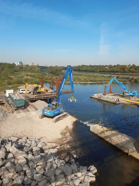 Eine besondere logistische Herausforderung war hierbei, dass das Baufeld aufgrund der Zufahrtsmöglichkeiten und der Schleusenbreiten nicht direkt mit den entsprechenden Pontons angefahren werden konnte. Somit musste der Trägerponton für den Raupenkran in zwei Teilen getrennt auf dem Wasserweg angeliefert und vor Ort zusammengebaut werden. Auch der Raupenkran musste auf dem Wasserweg in Einzelteilen angeliefert und vor Ort aufgebaut werden. Bei dem Versuch wurden zunächst in drei Wandabschnitten unterschiedlich lange Spundbohlen in die Gewässersohle gerüttelt. Die größten Profile waren 26 Meter lang, 1,4 Meter breit und etwa 25 Tonnen schwer. Diese Bohlen sollten dann möglichst 20 Meter in die Flusssohle eingebracht werden. Hierzu kam unter anderem eine 24 Tonnen schwere Vibrationsramme zum Einsatz. In zwei weiteren Feldern wurden die Versuche mit 24 und 18 Meter langen Profilen und einer Vibrationsramme mit 18 Tonnen Einsatzgewicht wiederholt. Um auch Vergleichswerte zwischen Vibrationstechnik und dem Einsatz eines Hydraulikhammers zu erhalten, wurde die gesamte Versuchsrei-he mit einem 16 und einem 26 Tonnen schweren Hydraulikhammer wiederholt. „Dabei werden die Spundbohlen nicht kontinuierlich wie mit einer Vibrationsramme in den Boden getrieben, sondern kontrolliert durch das Fallgewicht des Hammers im Boden versenkt“, erklärt Hesselink. Ohne den offiziellen Ergebnissen der Bundesanstalt für Wasserbau, welche den Versuch wissenschaftlich begleitet hat, vorzugreifen, konnte jedoch festgestellt werden, dass alle Profile mit den jeweiligen Geräten eingebracht werden konnten und, dass sowohl die Erschütterungen als auch die Lärmbelästigung deutlich unter dem erwarteten Level lagen.