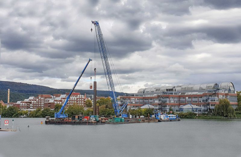 Die Arbeiten für die Proberammungen wurden gemäß den Planungen des Wasserstraßen-Neubauamtes Heidelberg Anfang Oktober aufgenommen. Die dafür vorgesehenen Spundwandprofile, welche für die spätere Baugrube verwendet werden sollen, konnten aufgrund der zuvor erkundeten Geologie nur mit schwerem Gerät eingebracht werden. Derartiges Equipment kommt üblicherweise nur offshore, wie beispielsweise für die Errichtung von Hafenanlagen, zum Einsatz. Als zusätzliche Herausforderung für den Ersatzneubau befinden sich in unmittelbarer Nähe zur Baustelle sensible bauliche Einrichtungen wie beispielsweise das Universitätsklinikum sowie Wohn- und Bürogebäude. Somit sollten mit dem Versuch mögliche Beeinträchtigungen durch Schall und Erschütterungen schon im Vorfeld dokumentiert werden, um die Baumaßnahmen gegebenenfalls entsprechend anpassen zu können. „Für die Proberammungen kam ein rund 215 Tonnen schwerer Raupenkran auf einem etwa 39 Meter langen und 15 Meter breiten Schwimmponton zum Einsatz“, schildert Hesselink und fügt hinzu, dass der Kran mit einem 50 Meter langen Gittermast ausgestattet gewesen sei.